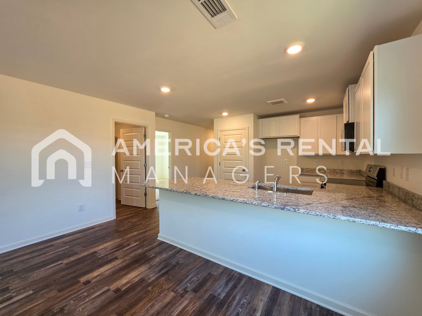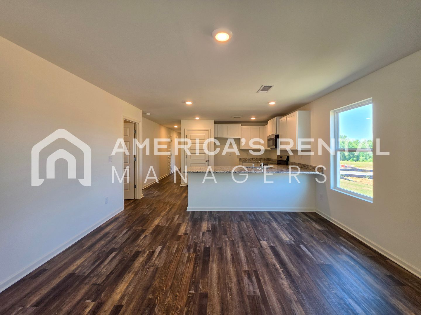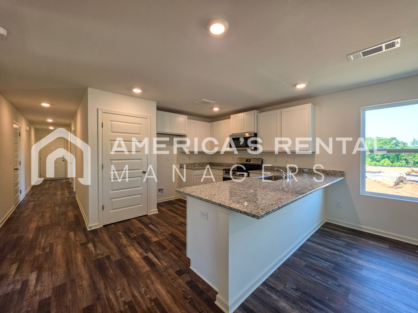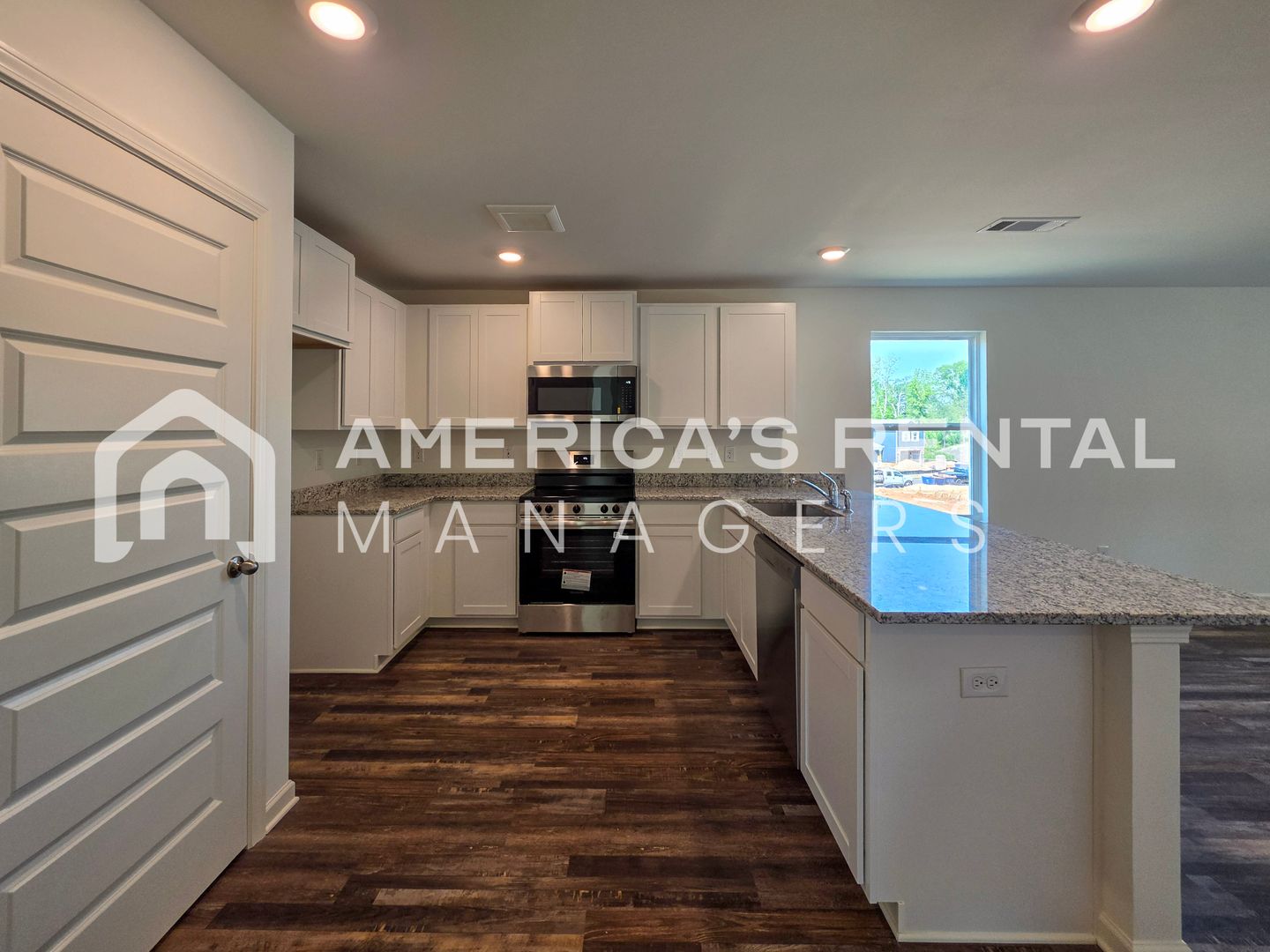The open-concept layout features luxury vinyl plank flooring throughout the main living areas and a chef-inspired kitchen complete with granite countertops and a large center peninsula, perfect for additional seating. The primary suite serves as a quiet retreat with a spacious walk-in closet and an walk in shower. Three additional guest bedrooms provide ample space and organization with generous closet storage.