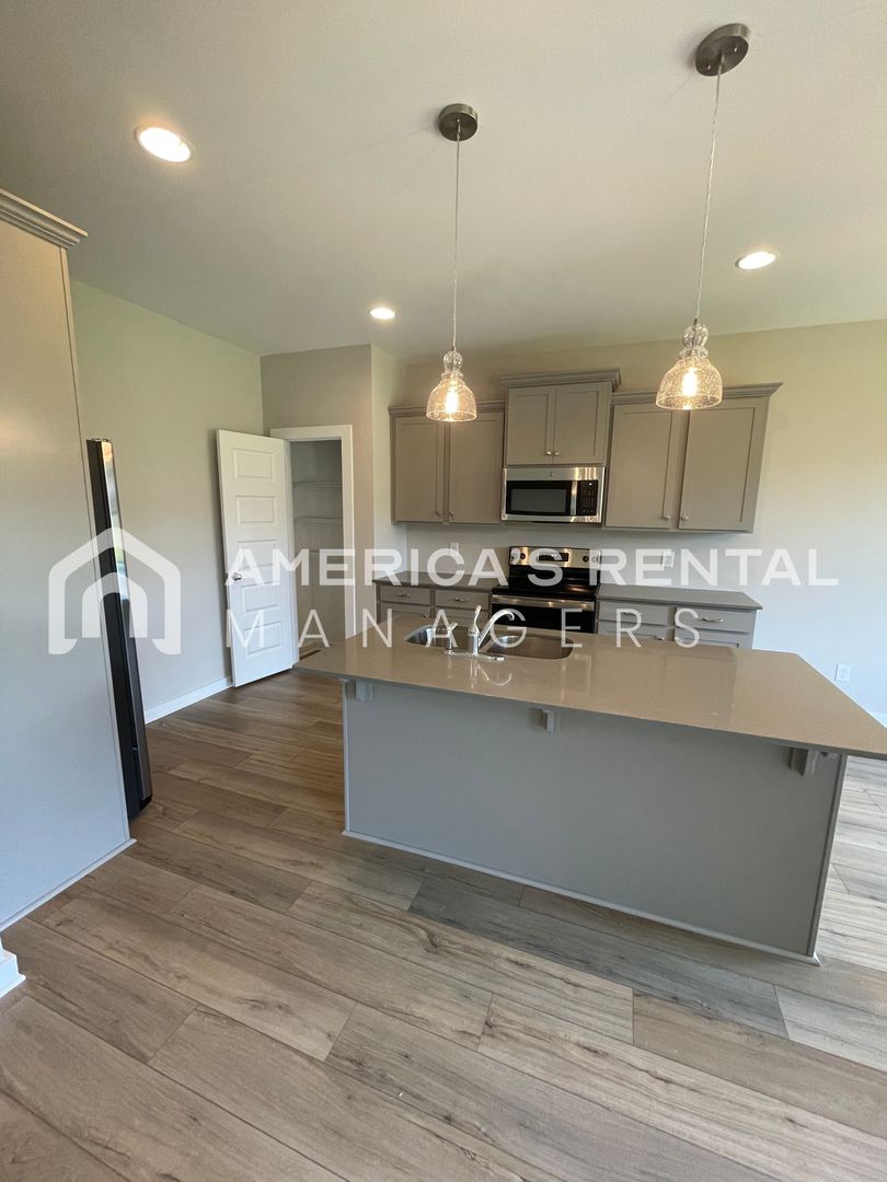One level home has an open floor plan with beautiful hard surface flooring. The large living room is great for entertaining and the open kitchen has tons of cabinet space, kitchen nook area, an island and pantry for additional storage space. Three guest bedrooms and master bedroom suite. Each guest bedroom is roomy and has ample closet space. The master bedroom suite is privately located at the back of the house and features a large bathroom with double vanity and walk in closet. Pet friendly home.